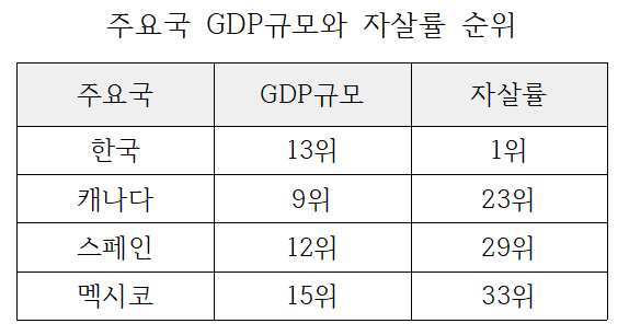 우리나라는 심각한 자살 오명국의 불명예를 안고 있다. 2024년 연간 자살사망자는 총 14,439명(잠정)으로, 일 평균 39.6명이 발생하였으며 자살률(10만 명 당 자살자 수)은 28.3명 수준으로 알려졌다. 경제 규모가 유사한 국가들의 낮은 자살률*에 비해, 우리나라는 경제협력개발기구(OECD) 국가 중 1위, 회원국 평균(10.6명)에 비해 2배 이상 높은 심각한 상황이다. 우리나라와 경제규모가 비슷한 주요국의 GDP 규모와 자살률 순위는 아래 표와 같다.