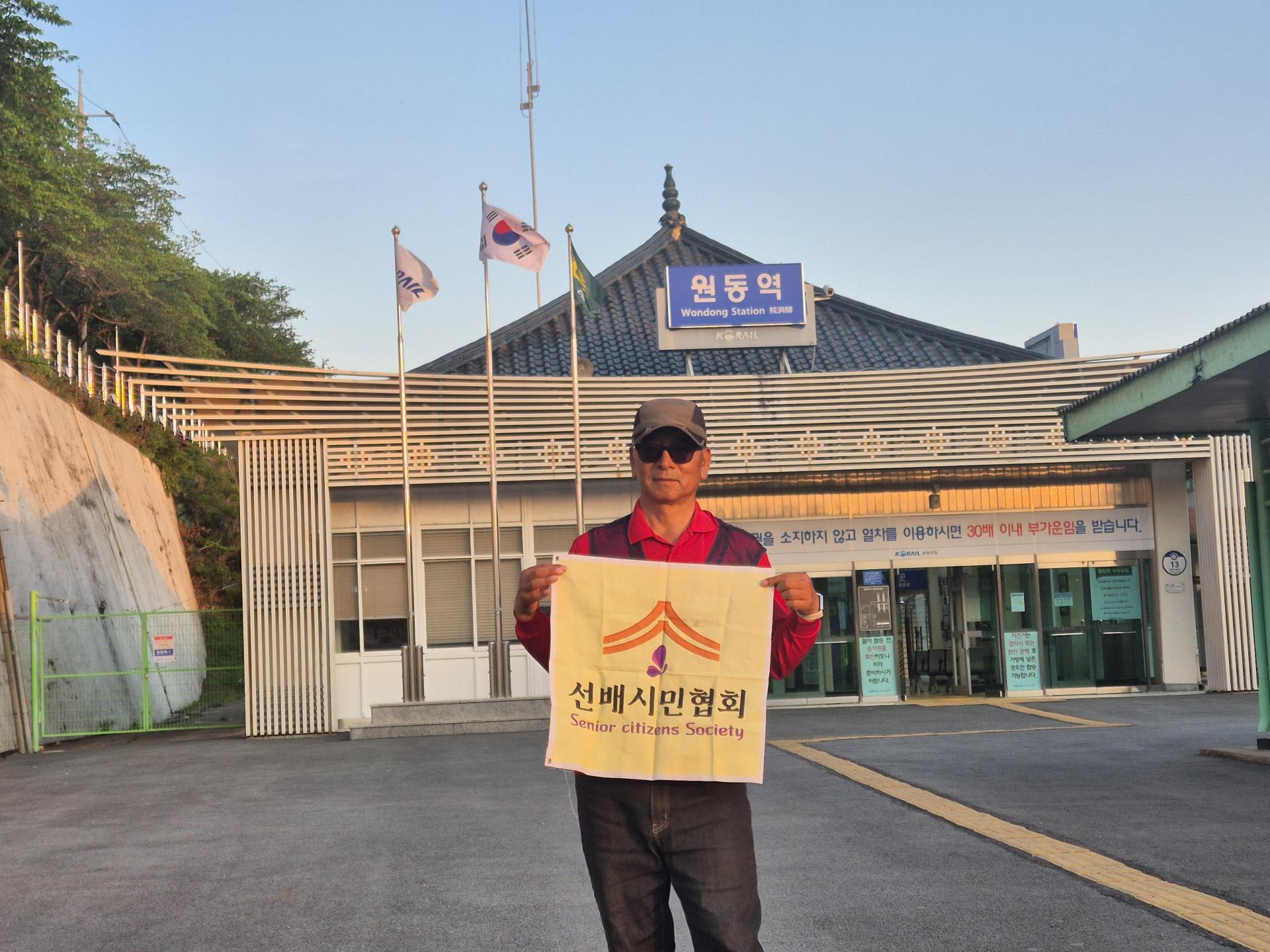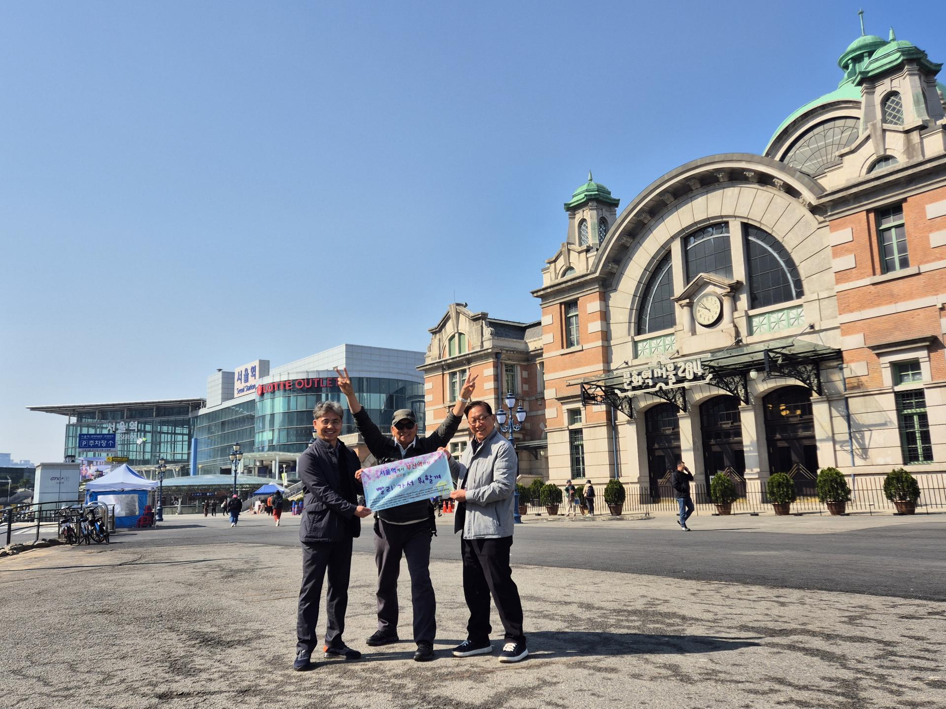 2025년 4월 7일. 서울역에서 선배시민협회 회원들과 출발 기념 촬영하고 있음
